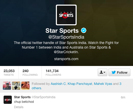 This entry was posted in Twitter on November 6, 2013 by twilight | Open » The perils of two twitter id’s and SM! Rofl “@daddy_san: @gkhamba @StarSportsIndia screenshot has been procured http://t.co/rWLLn7cESR”