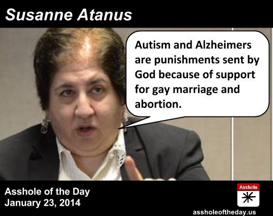 This entry was posted in Twitter on January 24, 2014 by twilight | Open » RT @assholeofday: #AssholeOfTheDay Susanne Atanus, for blaming autism and Alzheimers on gay marriage assholeoftheday.us/post/743112649… http://t.co/TKJ…