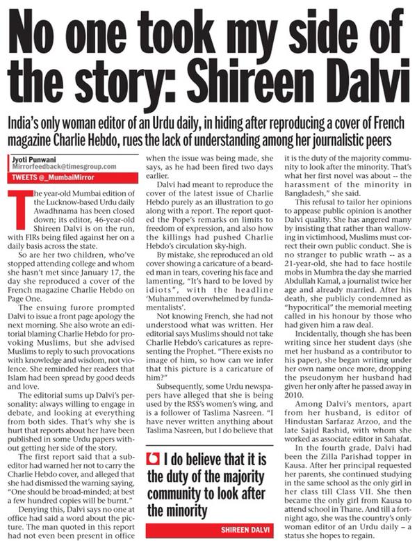 RT @ajit_ranade: 46yr old newspaper shuts down. india’s only woman urdu editor is on the run. nobody to take her side. #CharlieHebdo http://t.co/UKHMzBL0AA