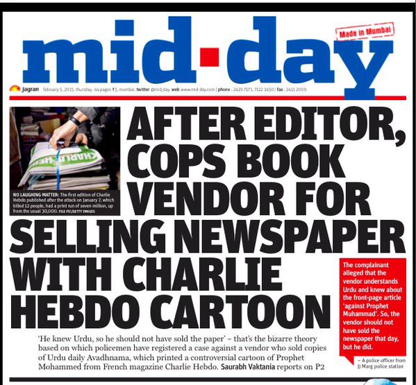 This entry was posted in Twitter on February 5, 2015 by twilight RT @SachinKalbag: Our lead story display on the ridiculous FIR against newspaper vendor for “knowing Urdu and still selling Avadhnama” http://t.co/hBuI3QiVWa