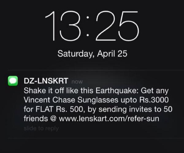Reply ↓ aakashbegins April 25, 2015 at 02:12 RT @twilightfairy: What is WRONG with brands @Lenskart_com ?? “@GhantaGuy: This is how humanity will meet it’s end. #Earthquake http://t.co…