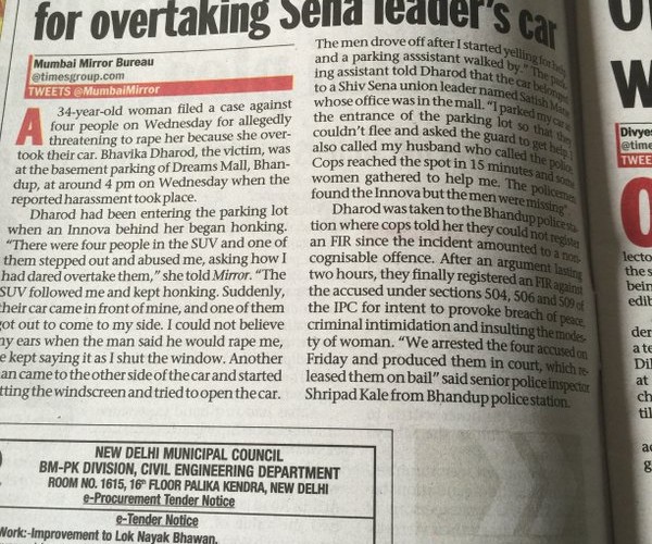 This entry was posted in Twitter on October 24, 2015 by twilight RT @anaggh: Woman harassed, threatened for overtaking Sena Leader’s car. YES it happens regularly. I have also had this problem. https://t.co/6CxMJN6o0k